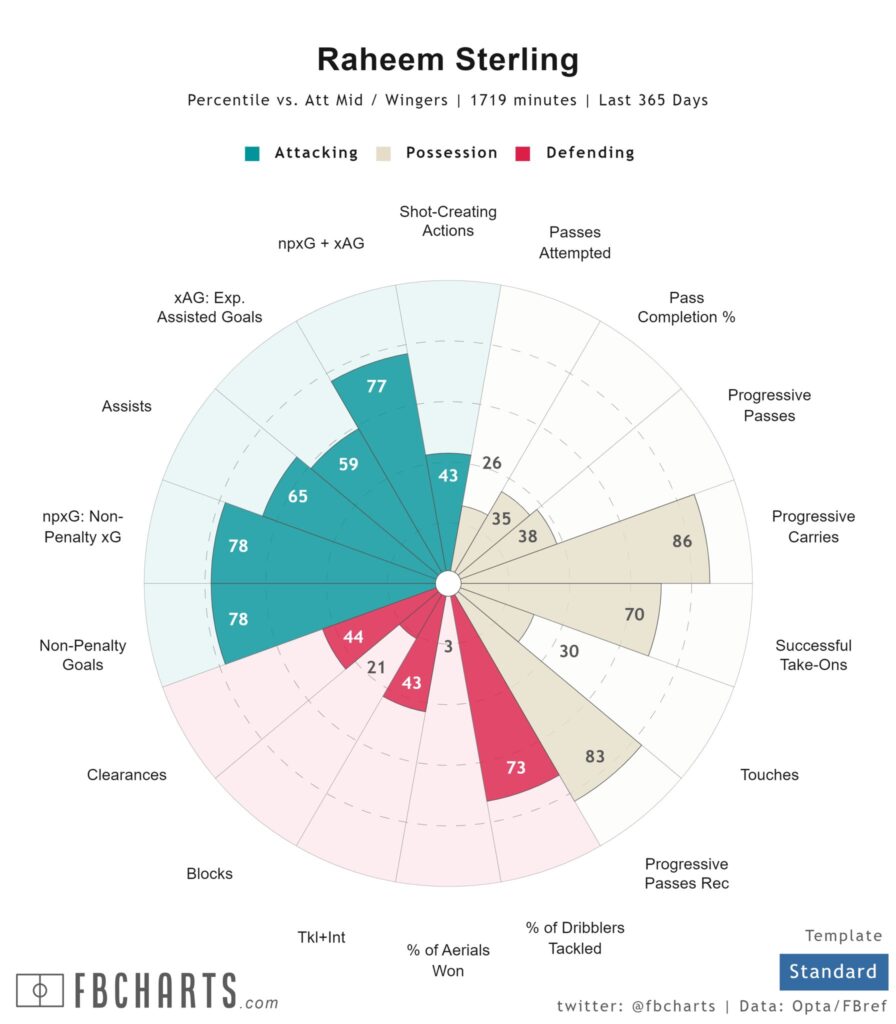 Sterling has improved with his positioning with time – getting into advanced channels + anticipating passing lanes to pull off shots has improved. Receiving passes into the final third has helped improve his xG rate drastically
